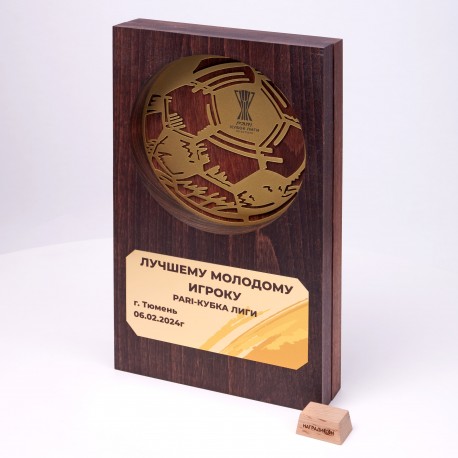 Приз представляет из себя деревянную конструкцию, оснащенную металлическими вставками мяча и таблички.